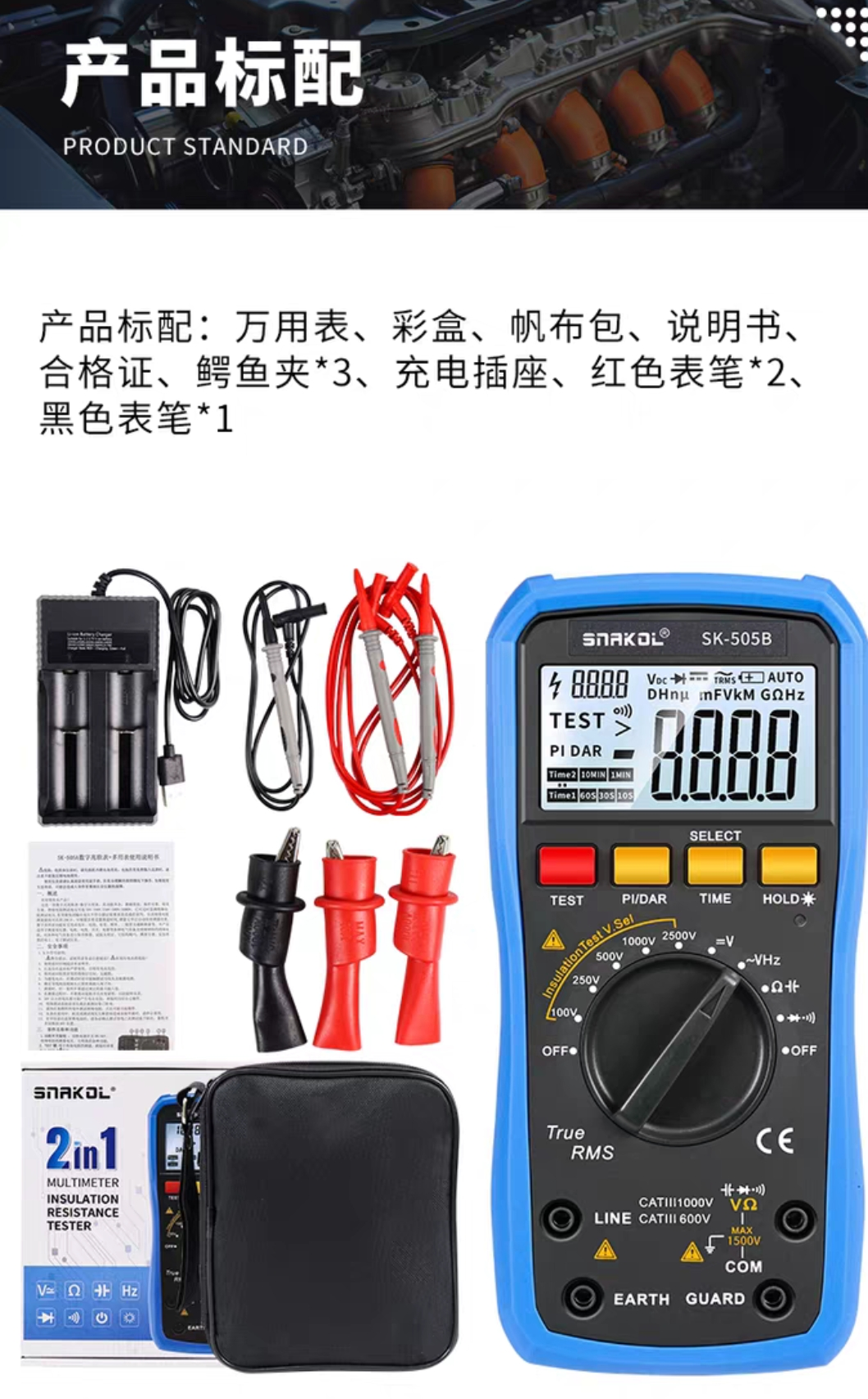 型號(hào):SK-505B;功能參數(shù):額定電壓50v-2500v,測(cè)量范圍0.5mΩ-50GΩ,交/直流電壓6v-1500v,通斷蜂鳴,數(shù)據(jù)保持,自動(dòng)關(guān)機(jī),尺寸:189mm*89mm*55mm
