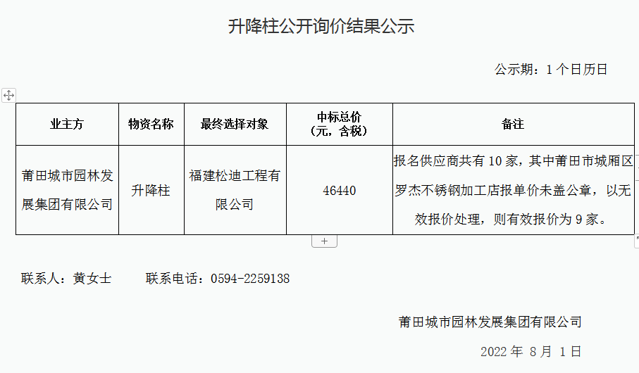 升降柱公開(kāi)詢(xún)價(jià)結(jié)果公示
